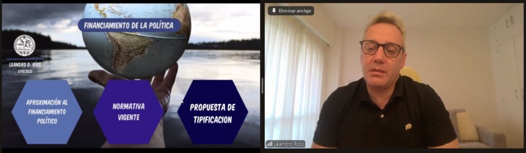 Durante su exposición, el Dr. Ríos abordó los principales ejes vinculados con la financiación de la política, los mecanismos de control y transparencia, y los desafíos contemporáneos que plantea la trazabilidad de los recursos en los procesos electorales, tanto desde la perspectiva normativa como desde la experiencia judicial y comparada.