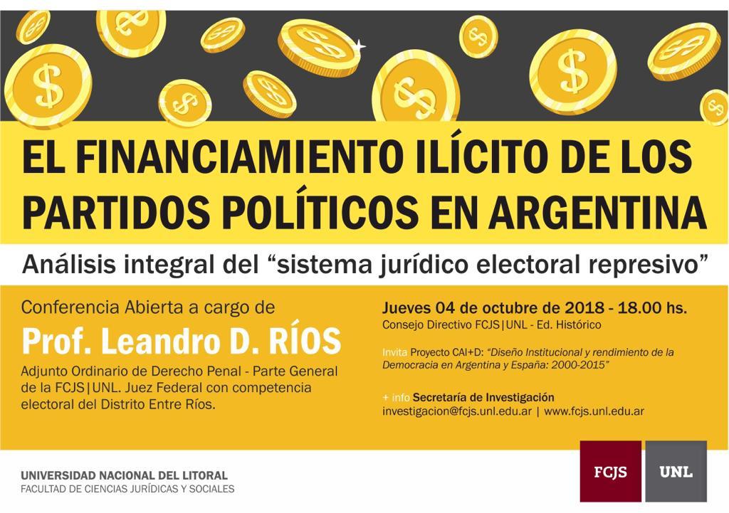 El 4 de octubre del 2018, el Prof. Leandro D. Ríos impartió una conferencia abierta en el Consejo Directivo de la Facultad de Ciencias Jurídicas y Sociales de la Universidad Nacional del Litoral (FCJS – UNL) sobre “El financiamiento ilícito de los partidos políticos en Argentina. Análisis integral del «Sistema Jurídico Electoral Represivo»”, en el marco de una actividad auspiciada por el Proyecto CAI+D “Diseño institucional y rendimiento de la Democracia en Argentina y España”, dirigido por el Prof. Julián Maneiro y organizada por la Secretaría de Investigación de esa casa de altos estudios. En la ocasión se reflexionó y debatió acerca de aspectos esenciales de la financiación política tanto lícita como ilícita.