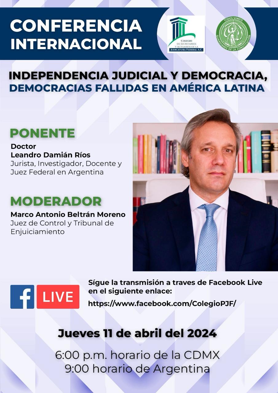 Se invita a la conferencia internacional encabezada por el jurista argentino Doctor Leandro Damián Ríos, que abordará un tema crucial en la actualidad política y social: “Independencia judicial y democracia. Democracias fallidas en América Latina”. Este evento será moderado por el distinguido Magistrado Marco Antonio Beltrán Moreno, Juez Federal de Control y Tribunal de Enjuiciamiento.