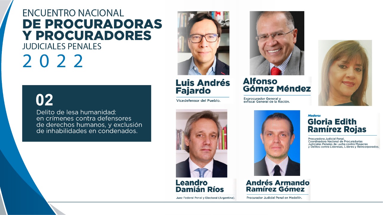 Gloria Edith Ramírez Rojas, Procuradora y Coordinadora Nacional de Procuradurías Judiciales Penales de Colombia moderó el Panel sobre delitos de lesa humanidad. Participaron Luis Andrés Fajardo, Vicedefensor del Pueblo (Colombia), Alfonso Gómez Méndez, Exprocurador General y exfiscal General de la Nación (Colombia), Andrés Armando Ramírez Gómez, Procurados Judicial Penal en medellín (Colombia). Leandro Damián Ríos, Juez Federal Penal y Electoral expuso sobre la experiencia y protagonismo de la Justicia Federal Ordinaria argentina, en el Juicio a las Juntas Militares llevado a cabo en Argentina en 1985. Dicho proceso es un ejemplo internacional en defensa de los derechos humanos y los juicios de lesa humanidad.