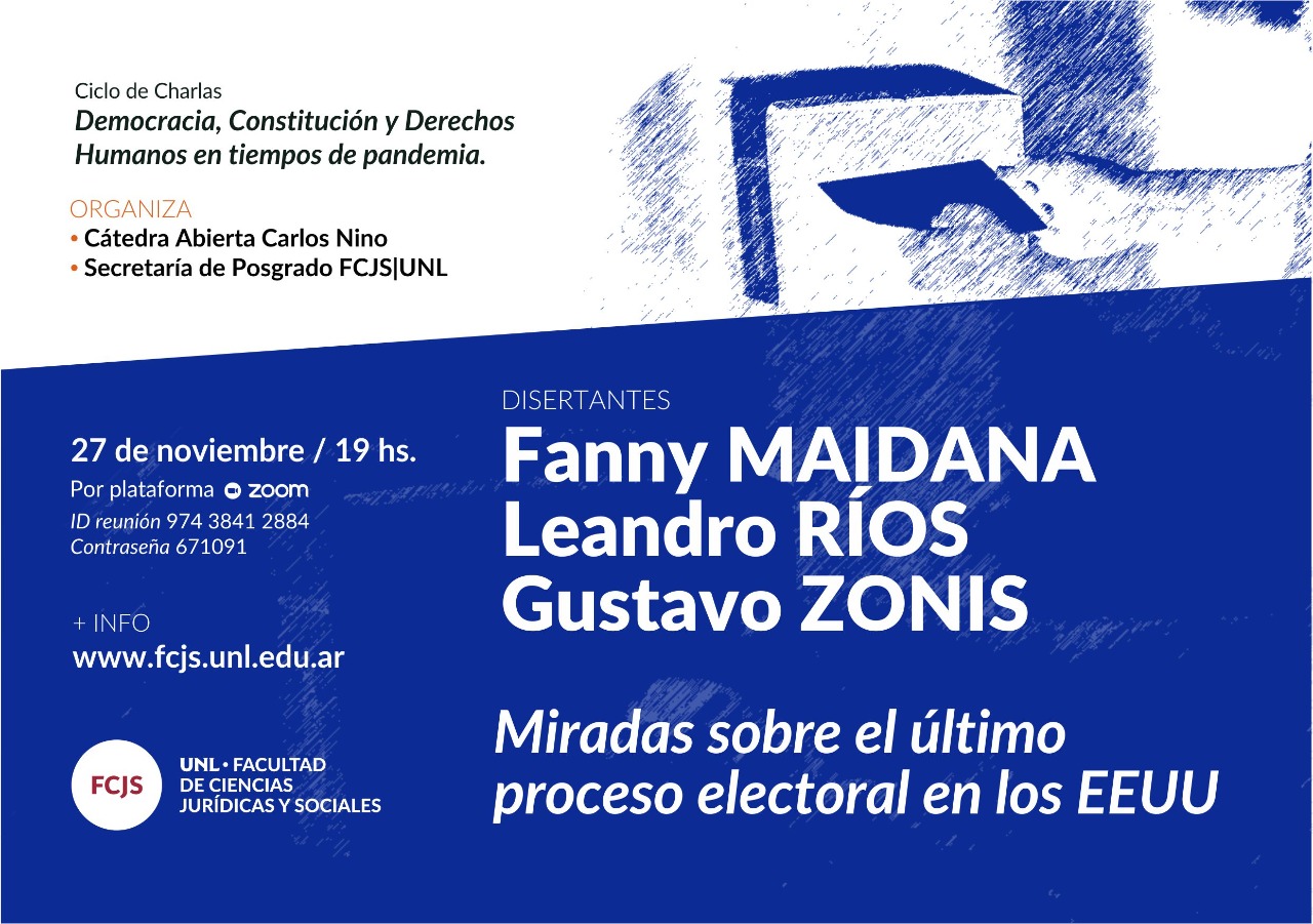 El 27 de noviembre de 2020, el Prof. Leandro D. Ríos, junto a los colegas Fanny Maidana y Gustavo Zonis, disertaron vía online en el panel “Miradas sobre el último proceso electoral de los EEUU”, en el Ciclo de charlas “Democracia, Constitución y Derechos Humanos en tiempos de pandemia”, evento organizado por la Cátedra Abierta Carlos Nino y la Secretaría de Posgrado de la Facultad de Ciencias Jurídicas y Sociales de la Universidad Nacional del Litoral (FCJS – UNL). Dicho evento estuvo coordinado por el Sr. Decano esa casa de estudio, Prof. Javier Francisco Aga.